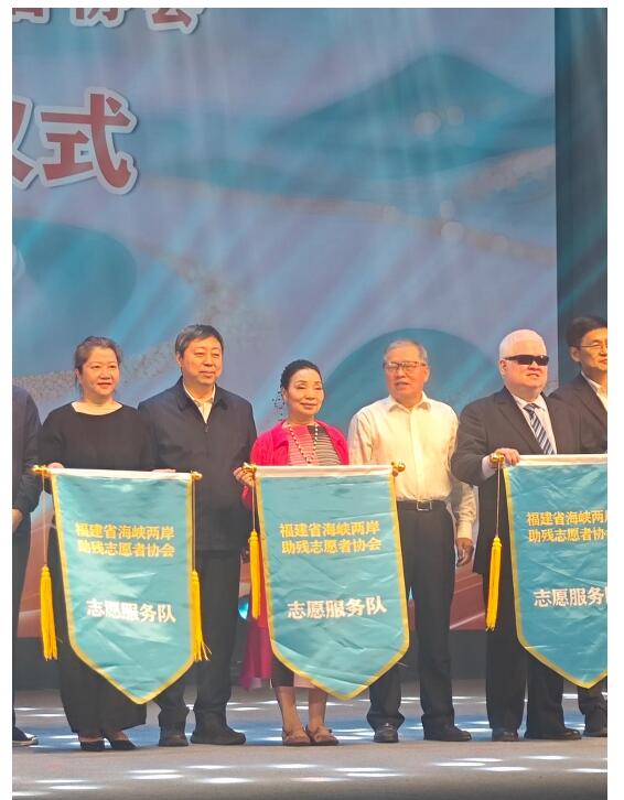 晚会中场举行的福建省海峡两岸助残志愿者协会志愿服务队授旗仪式将活动推向高潮。台中市亚斯伯格症肯纳症协进会理事长陈习珍作为台湾代表受邀上台,郑重接过志愿服务队旗帜。她双手握旗,眼眶湿润,这一刻不仅是个人的荣誉,更是两岸助残事业共同理念的象征。