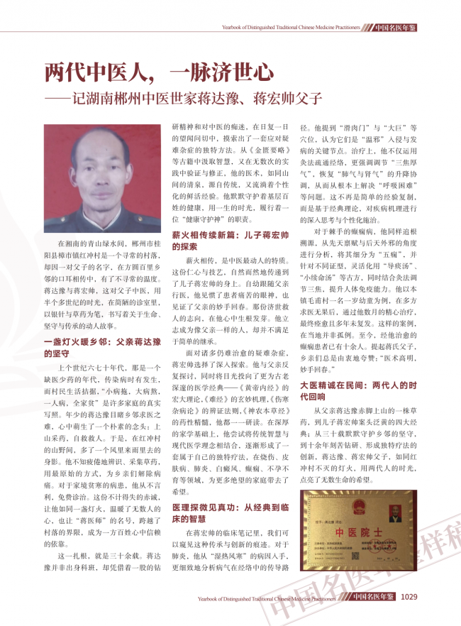 在美丽的湖南省,郴州市桂阳县樟市镇红冲村,有这样一对父子医生;蒋达豫和蒋宏帅秉承中医世家薪火相传的医术品格和全心全意为人民服务的精神,成为一方美谈。 父亲蒋达豫1964 年至1973年毕业完成自学业高中。上个世纪六七十年代传染病多发,村民经济困难。蒋达豫为解除看病难,自发到山上采集各种草药,风里来雨里去从不喊苦不喊累,在当地村民心中极有威望,对家庭困难的病患免费治疗,提起蒋医师方圆百里无人不晓。 蒋达豫在桂阳县行医三十余载,履行着基层健康守护神的职责。他默默无闻把毕生精力投入在中医药治病救人的行业中,努力守护一方百姓的安康。实在让人想不到,又不能不感叹的是,一个乡间老中医,凭着自己执着的追求和对中医造诣的痴恋钻研,几十年来竟摸索出了一整套对付疑难杂症的良药妙法。